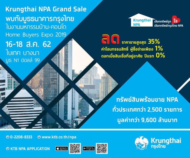 เลือกทรัพย์ถูกใจ ตอบโจทย์ทุกความต้องการ ธนาคารกรุงไทย นำทรัพย์สินพร้อมขาย NPA จำนวนกว่า 2,500 รายการ มูลค่ากว่า 9,600 ล้านบาท ร่วมในงาน Home Buyer Expo 2019 (มหกรรมบ้าน-คอนโด) ณ บูธ N1 ฮอลล์ 99 ไบเทค บางนา