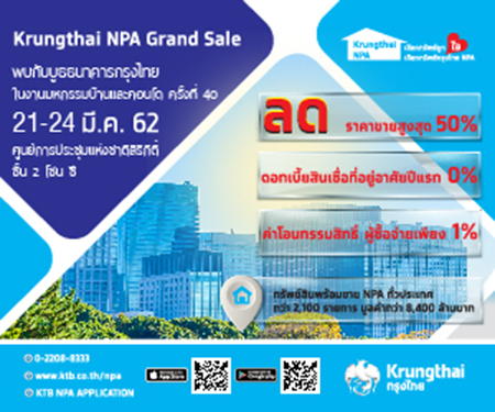 ทรงพล ตั้งกิจถาวร ผู้ช่วยกรรมการผู้จัดการใหญ่ ผู้บริหารกลุ่มบริหารทรัพย์สินพร้อมขาย บมจ.ธนาคารกรุงไทย เปิดเผยว่า ธนาคารได้เข้าร่วมออกบูธงานมหกรรมบ้านและคอนโด ครั้งที่ 40 ตั้งแต่วันที่ 21-24 มีนาคม 2562 ณ ศูนย์การประชุมแห่งชาติสิริกิติ์ โดยนำทรัพย์สินพร้อมขาย (NPA) ทั่วประเทศ ในเขตกรุงเทพฯ ปริมณฑล และภูมิภาค ทั้งประเภทเพื่ออยู่อาศัยและเพื่อการลงทุน กว่า 2,100 รายการ มูลค่ารวมกว่า 8,400 ล้านบาท มาลดราคาสูงสุดถึง 50% พร้อมโปรโมชั่นดอกเบี้ย 0% นาน 12 เดือน และผู้ซื้อชำระค่าโอนกรรมสิทธิ์เพียง 1% เท่านั้น จึงเป็นโอกาสทองของผู้สนใจ NPA ที่ต้องรีบตัดสินใจในการพิจารณาซื้อทรัพย์เพื่ออยู่อาศัยเองหรือเพื่อการลงทุน